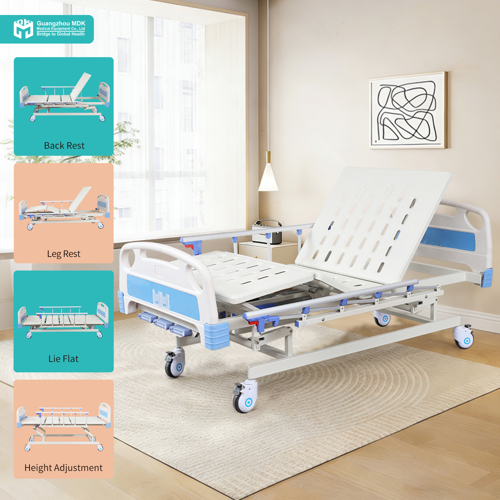 Configuration Manual 3-Crank Bed (Punched Plate) + PP Boards + Aluminum Guardrails + Single Casters + ABS Cranks