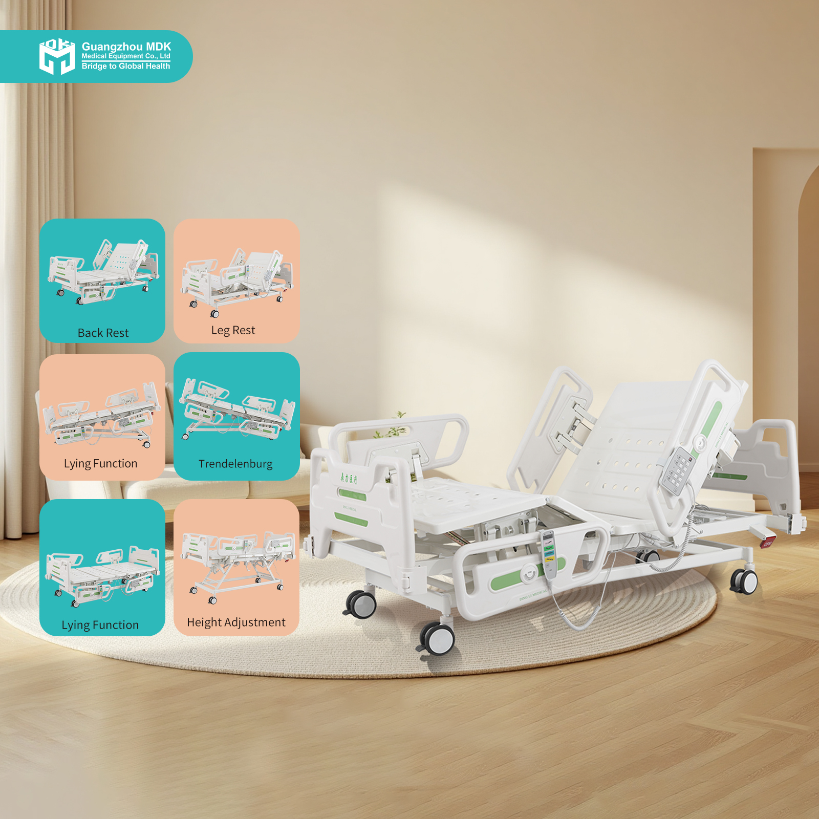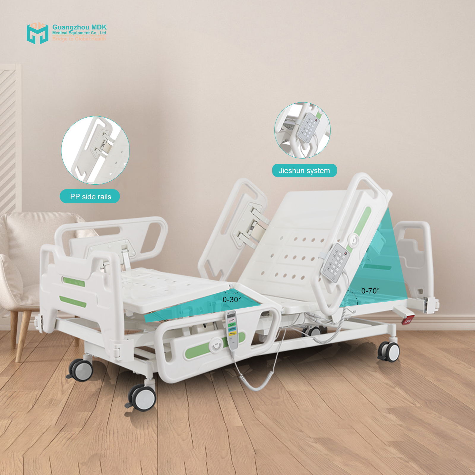 This premium electric 5-function nursing bed provides advanced patient care, equipped with a comprehensive nurse control panel and a reliable Jieshun motor system featuring battery backup and Dual CPR. Built on a heavy-duty carbon steel frame with a 1.0mm punched plate, it undergoes rigorous acid washing and electrostatic powder coating for ultimate anti-peeling resistance. Complete with DL PP 4-piece guardrails, an anti-pinch backrest, and 4-wheel braked casters, it ensures maximum safety and operational efficiency for modern healthcare facilities.
