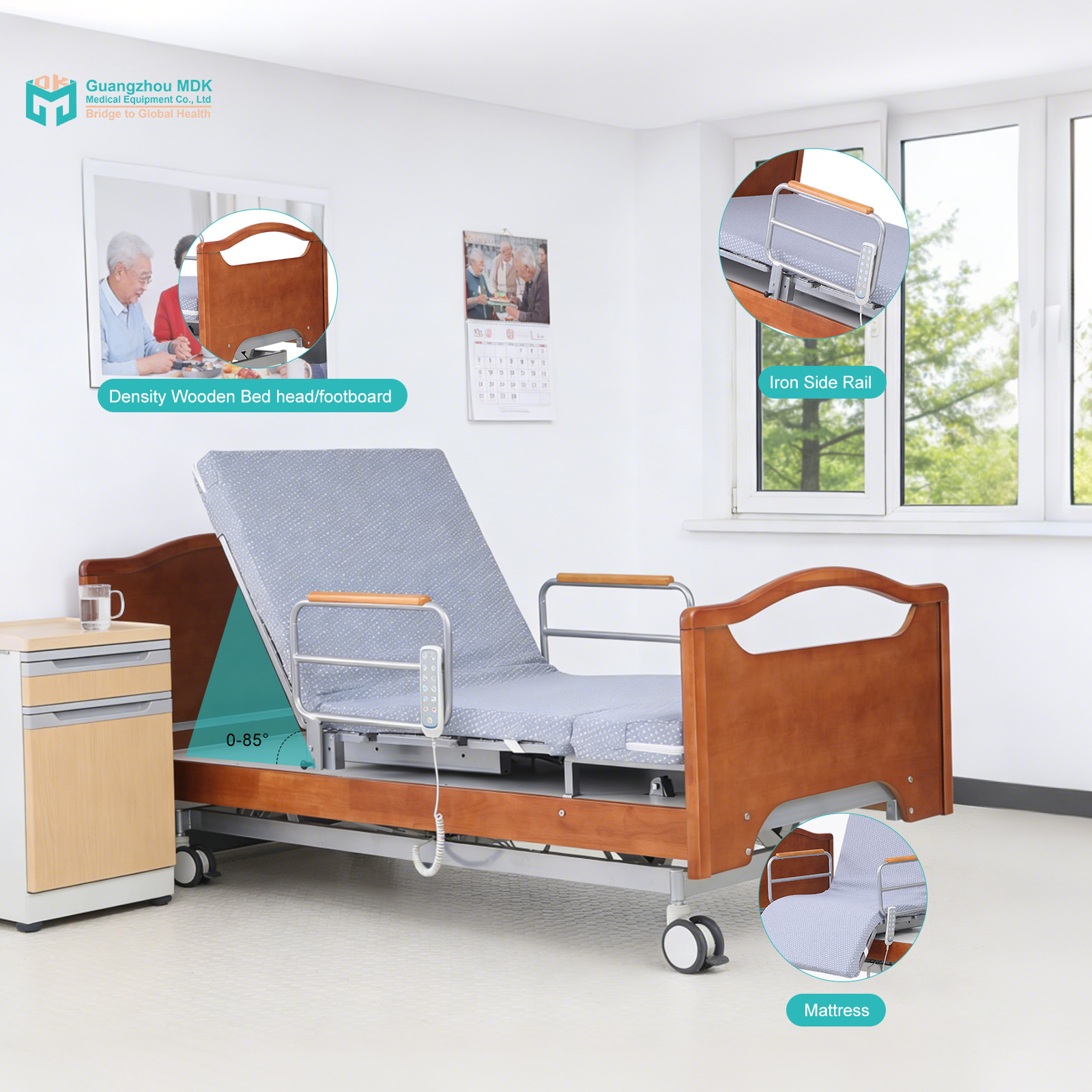 Designed to bridge the gap between hospital capability and home comfort, this electric 5-function bed features an advanced rotation system. Caregivers can effortlessly rotate the bed surface, transforming it into a chair-like position to assist patients with limited mobility in getting in and out of bed. It also provides essential positioning including backrest (0-85°), leg elevation (0-40°), height adjustment, and Trendelenburg/Reverse Trendelenburg (0-12°). (Note: A minimum clearance of 400mm from the wall is required for safe rotation).