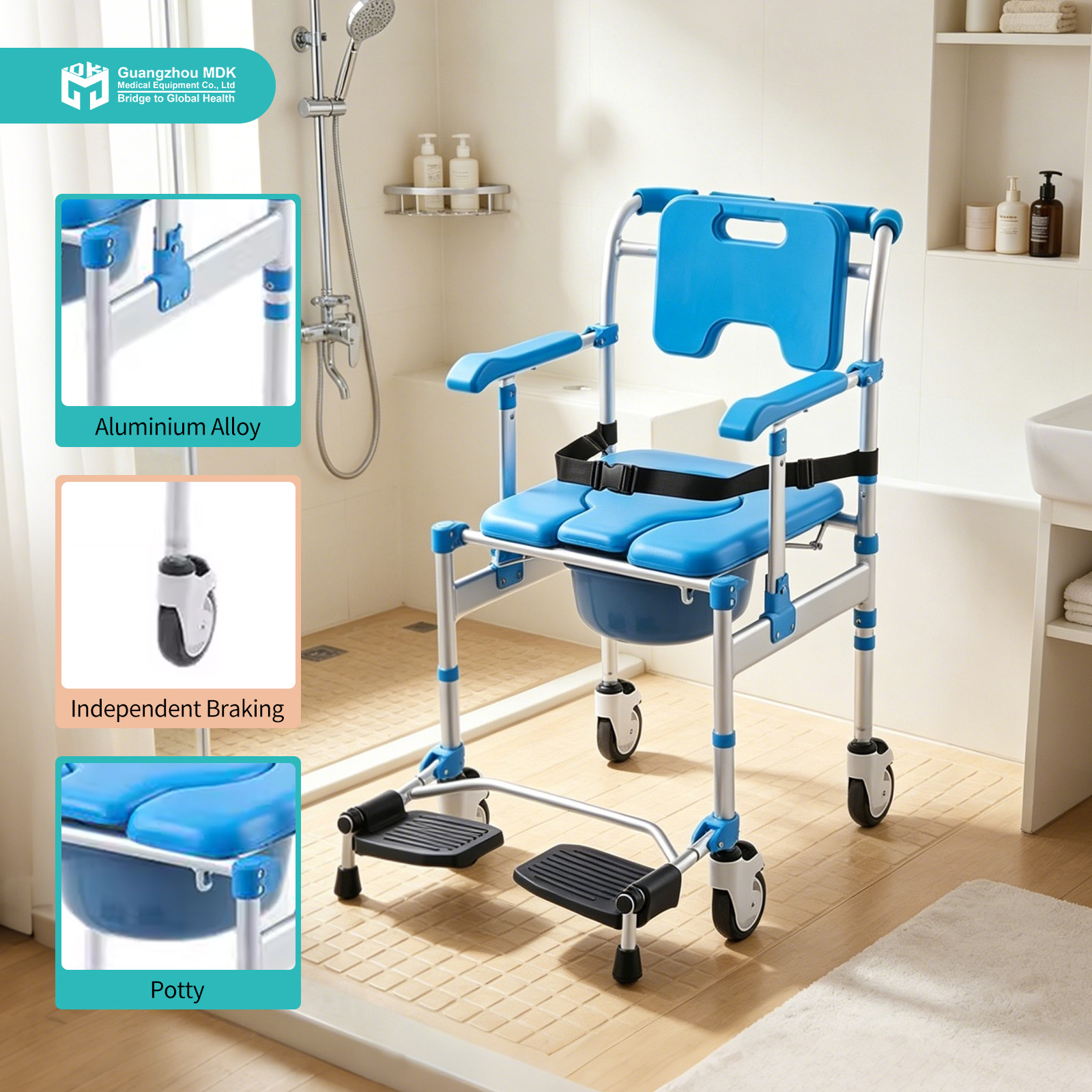 For long-term use, the chair is fitted with a racket-shaped soft PU leather seat that balances comfort with easy sanitization. The HD-PE commode bucket is durable and can be removed from multiple directions. From a logistics perspective, the chair is highly efficient for international shipping, with a net weight of only 8.1kg per unit, ensuring it is both easy for caregivers to handle and cost-effective to transport in its compact, disassembled state.