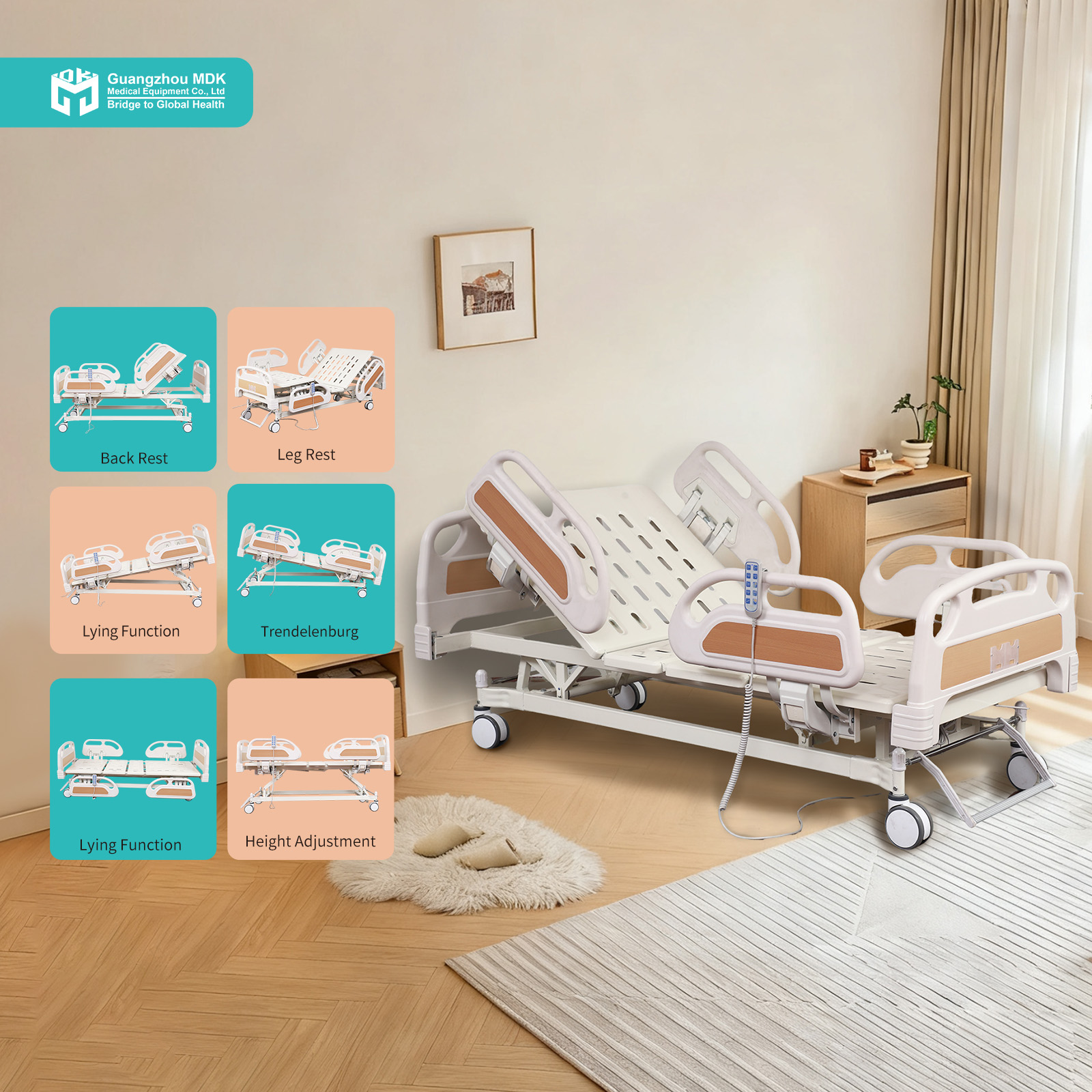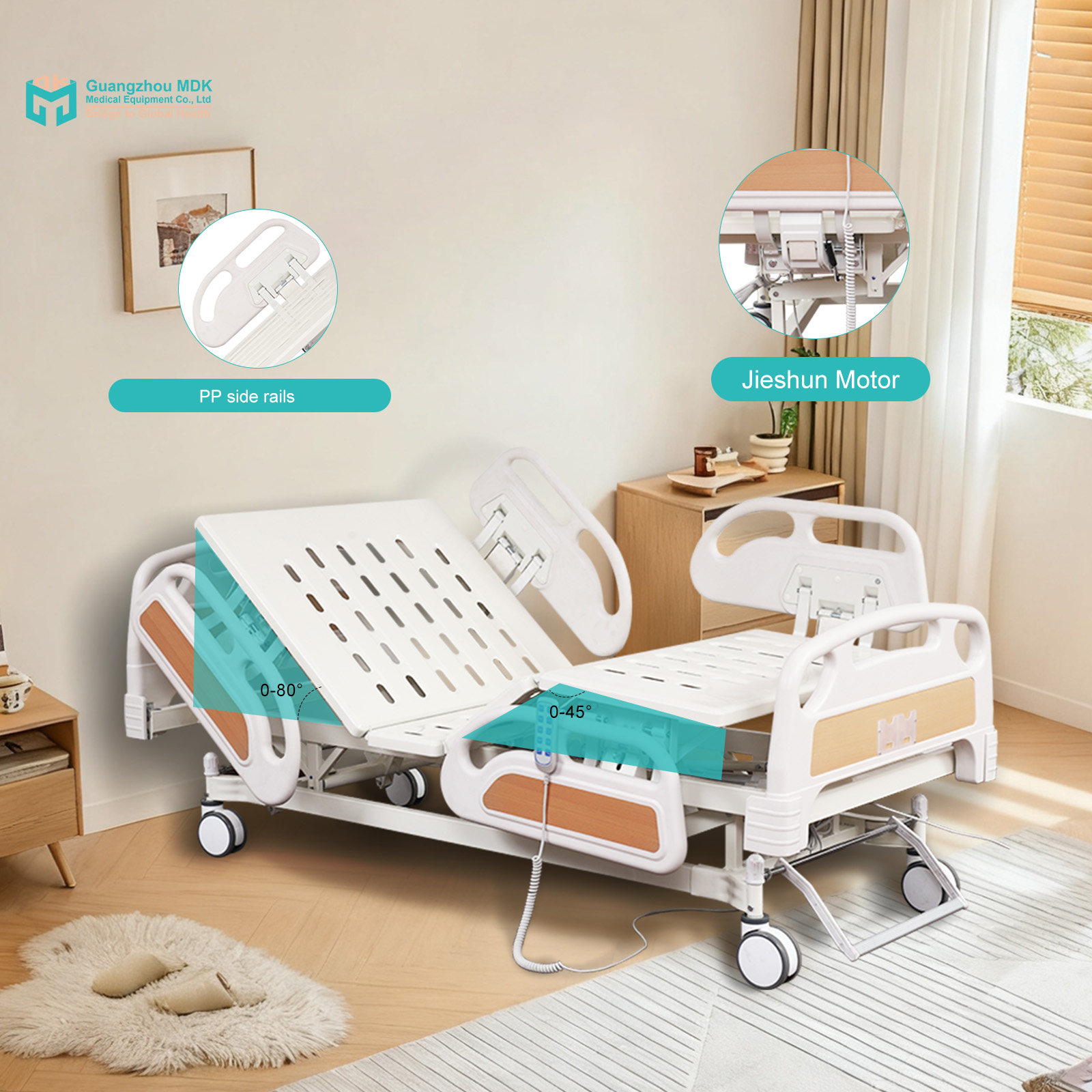 | Configuration | Electric 5-Function Bed (Punched Plate) + PP Boards + 4-Piece PP Guardrails + Central Casters |
