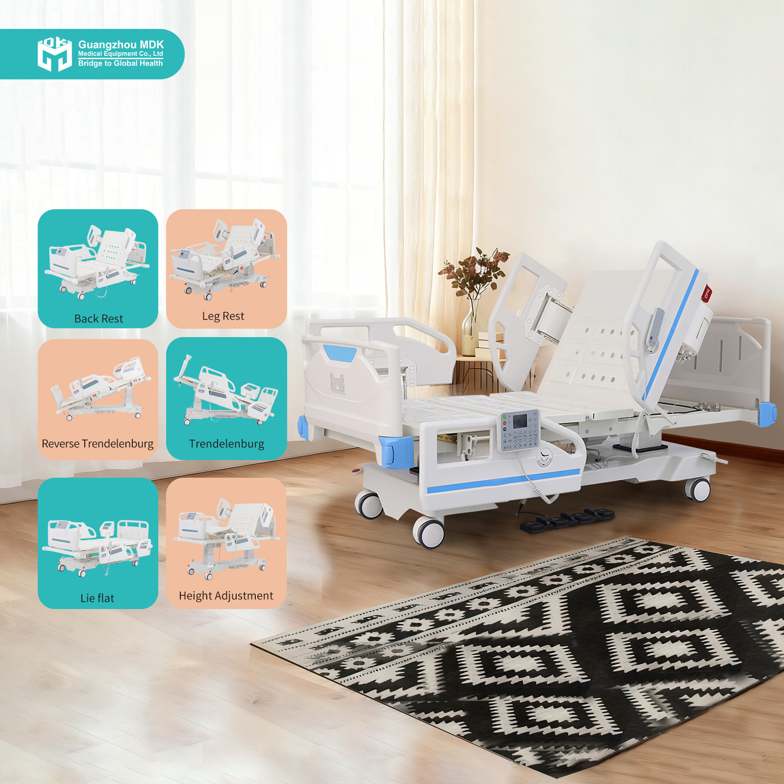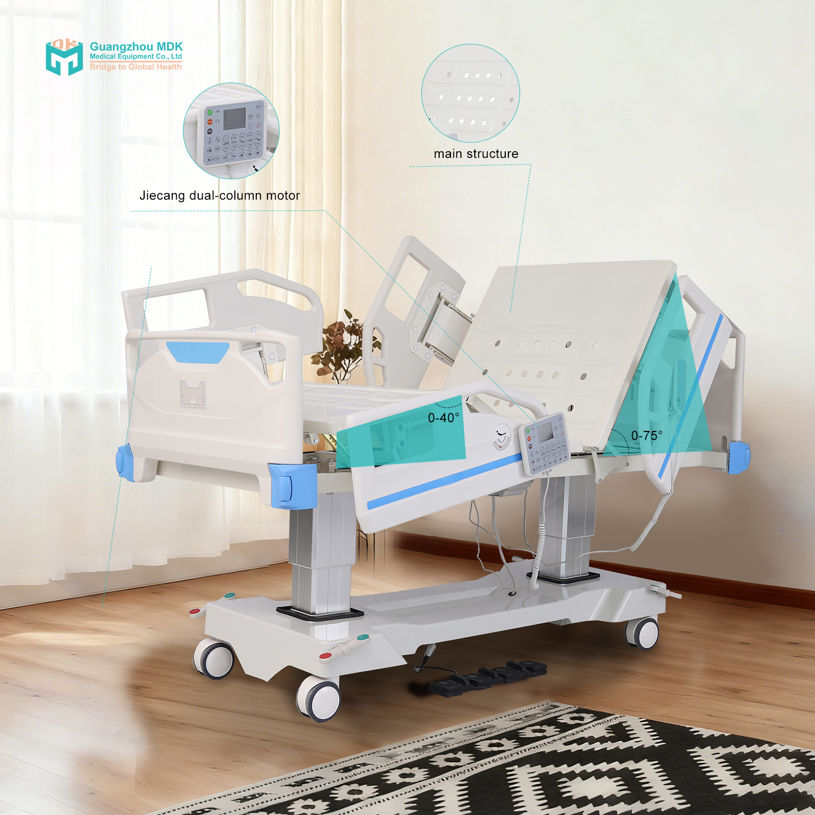 Engineered for the most demanding critical care environments, this elite 7-function bed utilizes an innovative two-column lifting design for unmatched stability. It features an integrated precision Weighing Scale, allowing caregivers to monitor patient weight continuously without transfer. Powered by a top-tier Jiechang motor, it offers comprehensive positioning: Backrest (0-75°), Leg elevation (0-40°), Trendelenburg/Reverse (0-15°), Left/Right Lateral Tilt (0-20°), and Hi-Low adjustment (540-840mm). Operation is made effortless through a Triple Control System, including a Nurse Control Panel, hand remote, and hands-free foot pedal.