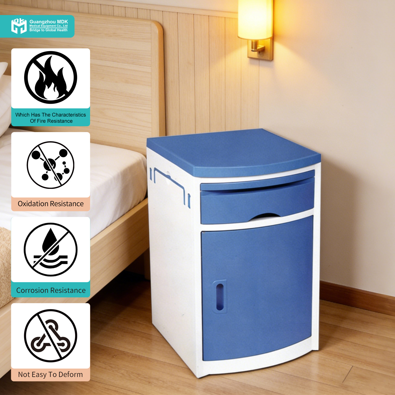 Designed with the patient’s daily comfort in mind, this cabinet offers a complete bedside storage solution. The top plate is thoughtfully designed with a secure thermos holder to prevent spills. Below, an easy-access drawer secures personal items, while the lower main cabinet provides ample space for daily necessities. The small cabinet model is specifically equipped with adjustable interior partitions, maximizing vertical space to easily store taller items such as thermos flasks and medical supplies.